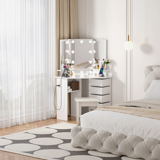 깊이는 많은 구매자들이 매일 사용하기 전까지는 간과하는 세부 사항입니다. 소형 공간용으로 설계된 서랍이 있는 메이크업 거울대는 일반적으로 35~45cm(14~18인치)의 깊이가 가장 적합합니다. 더 깊은 디자인은 수납 면에서 매력적으로 보일 수 있지만, 종종 새로운 문제를 야기합니다. 의자가 완전히 밀려들지 못하거나, 서랍이 주변 가구와 부딪히며 통로가 좁아지는 문제가 발생하죠. 얕은 깊이의 거울대는 보다 원활한 움직임과 더 편안한 일상 생활을 지원합니다.