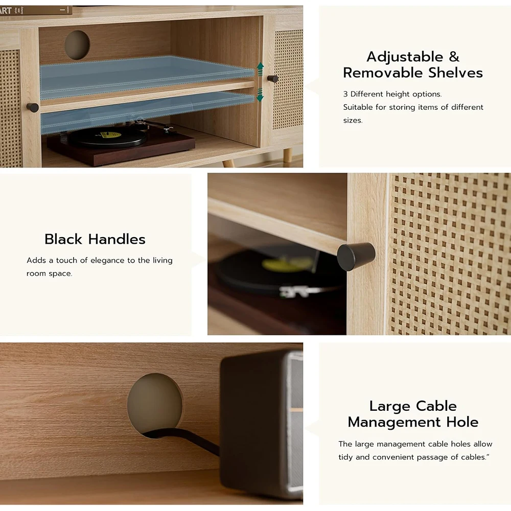 TV 65" အထိအသုံးပြုနိုင်သောခေတ်မီ TV စတန်း၊ ကဗျားနှစ်လုံး၊ ရက်တန်တံခါးနှင့် သစ်သားစင်များပါသော အိမ်သုံးပစ္စည်း ဧည့်ခန်းအတွက် မီဒီယာစင်