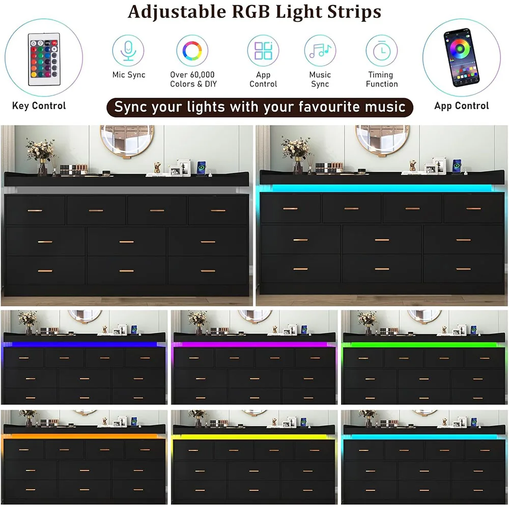 10 Drawer Wood Dresser LED Light Charging Station Modern Chest Drawers Closet Wide Drawer Organizer Cabinet Living Room Entryway