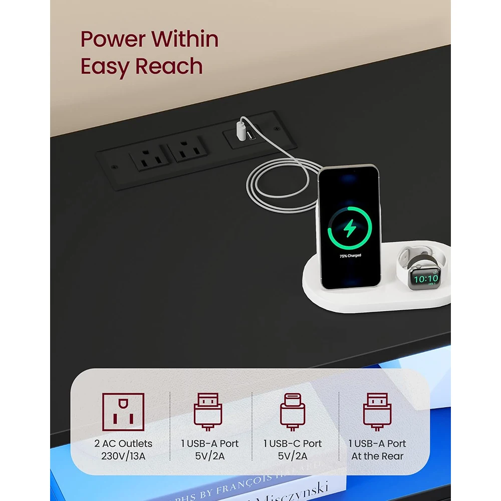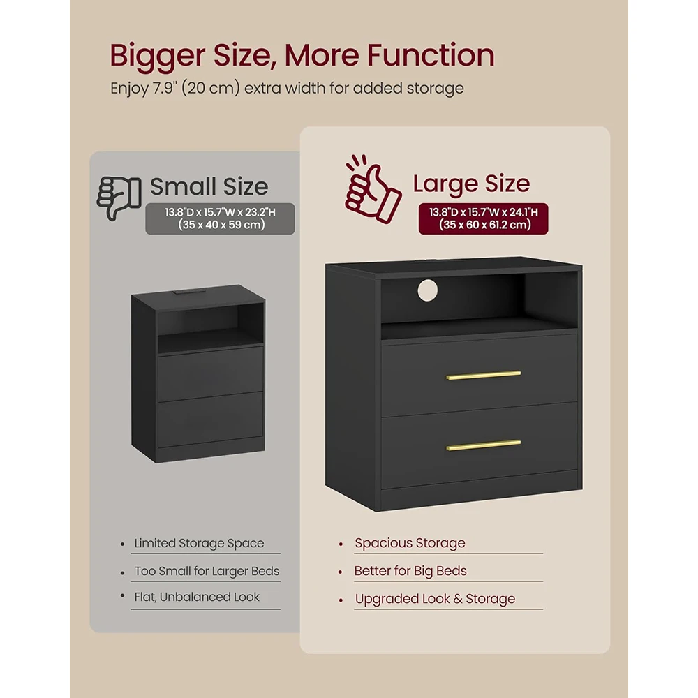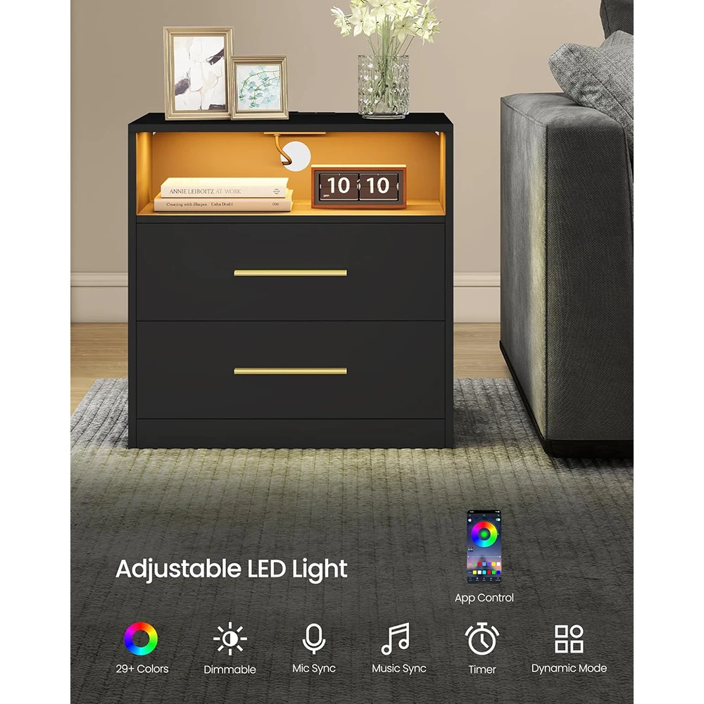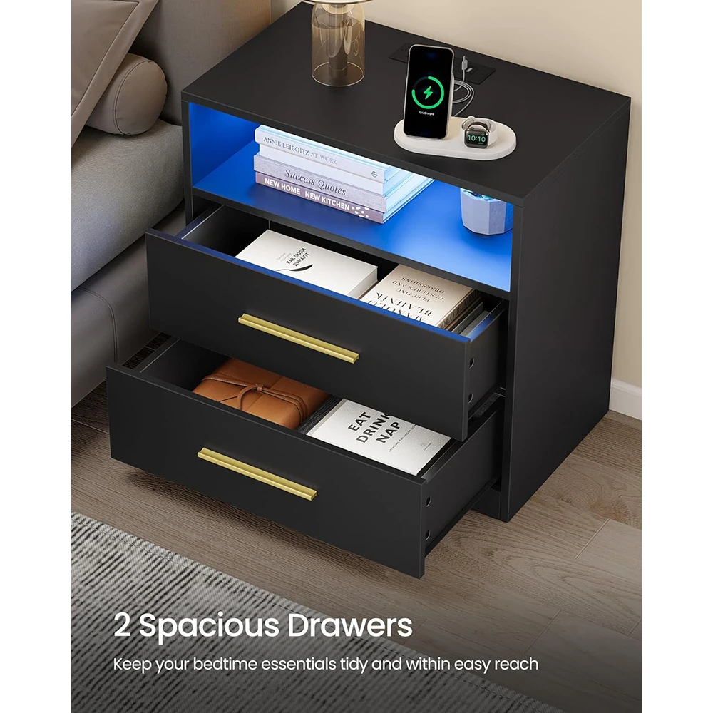23.6 Inch Wide Wooden Durable Nightstand Charging Station LED Lights Modern Side End Table Drawers Open Shelf 2 AC Outlets USB