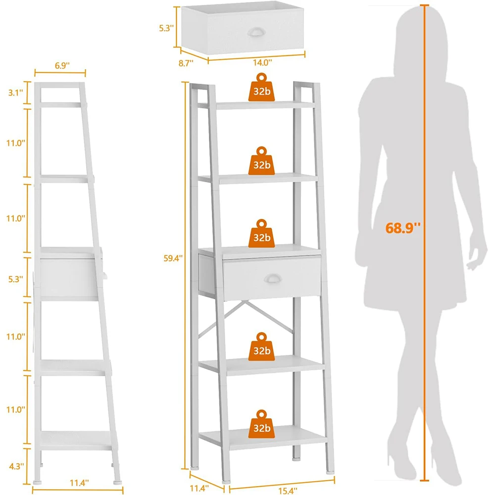 5 Tier Wooden/Metal Modern Bookshelf Ladder Shelf Drawer Tall Narrow Storage Organizer for Living Room Home Office