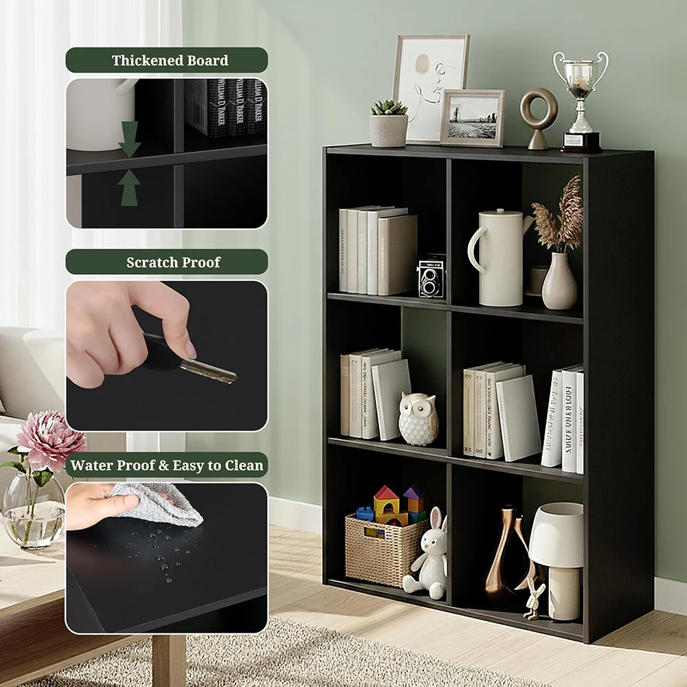 6-Cube Wooden Storage Organizer Black Bookshelf Open Compartments Home Office Modern Display Shelf Living Room Bedroom Entryway