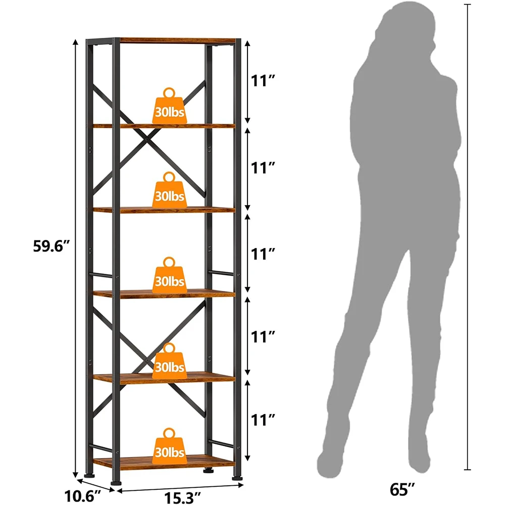 6 Tier Modern Tall Narrow Bookshelf Wood Metal Storage Rack Back Organizer for Living Room Home Office Entryway Kitchen Rustic