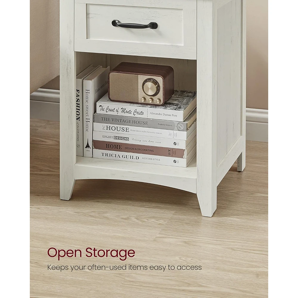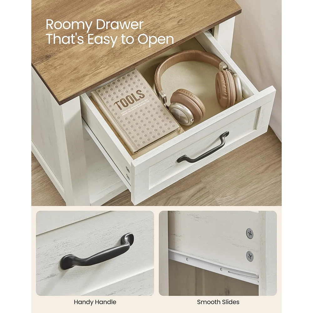 Farmhouse Smart Nightstand Wooden Charging Station Bedside Table Side Table Drawer Open Compartment Bedroom Rustic White Honey