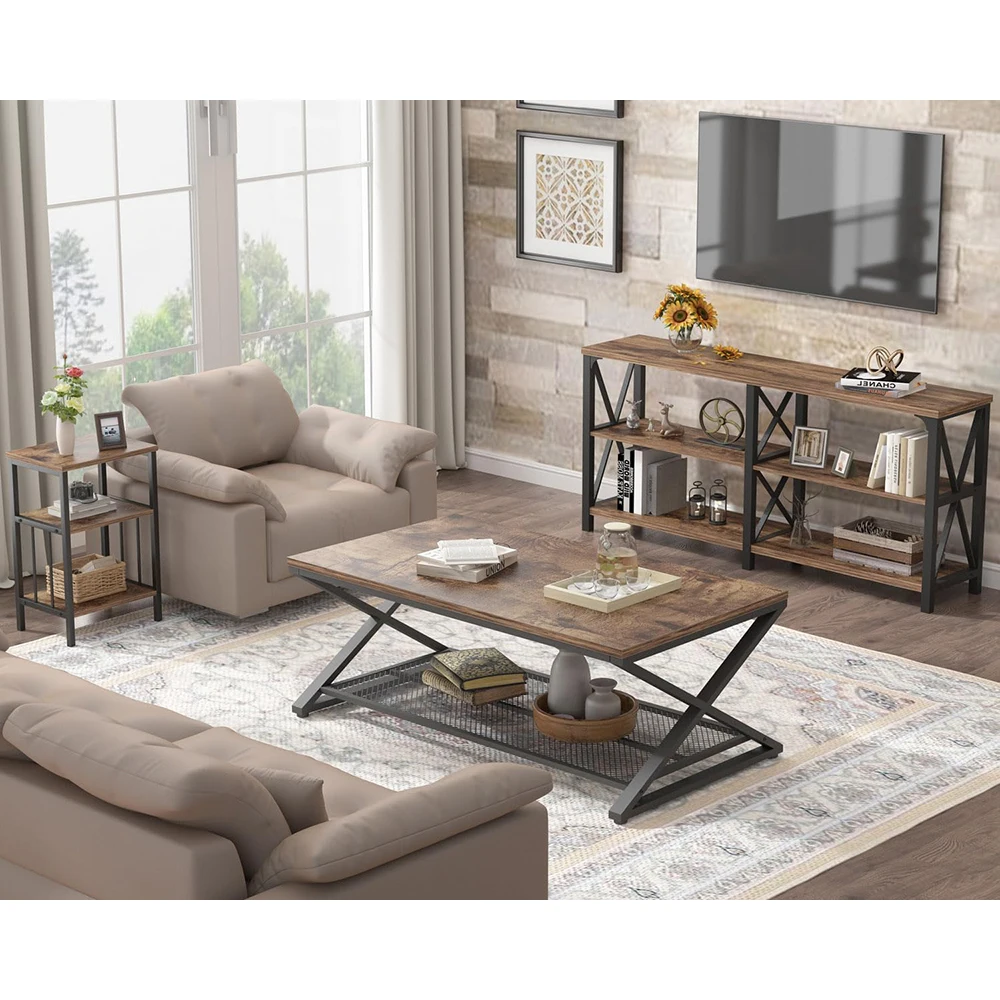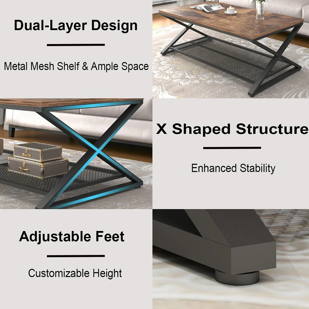 Modern Coffee Table Storage Industrial Wood Metal 2 Tier Mesh Shelf Living Room Table Low Rectangle Cocktail Tea Table Office