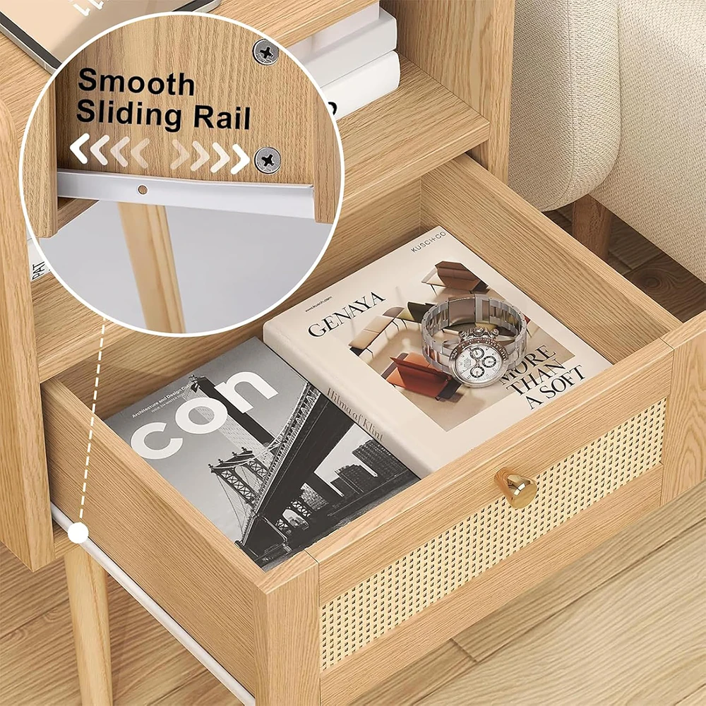 Modern Wood Night Stand Charging Station with Storage Rattan End Table for Small Space Bedroom Kids' Dorm Natural