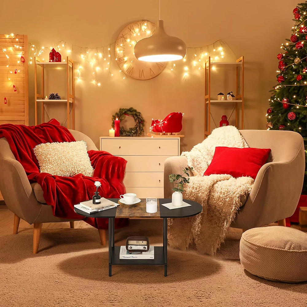 Nu-Deco 2-Tier Small Oval Coffee Table Storage Shelf Industrial Modern Style Wood Tabletop Metal Frame for Living Room Home