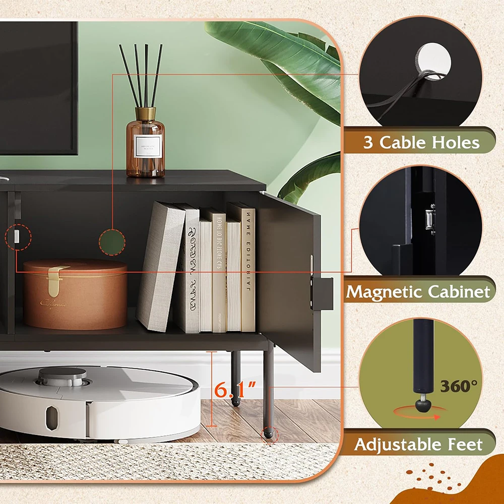 Nu-Deco Farmhouse 65-Inch TV Stand with 2 Storage Cabinets Open Shelf Wooden Material Metal Legs Black for Living Room & Bedroom