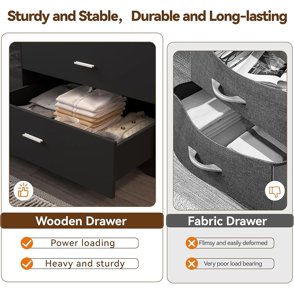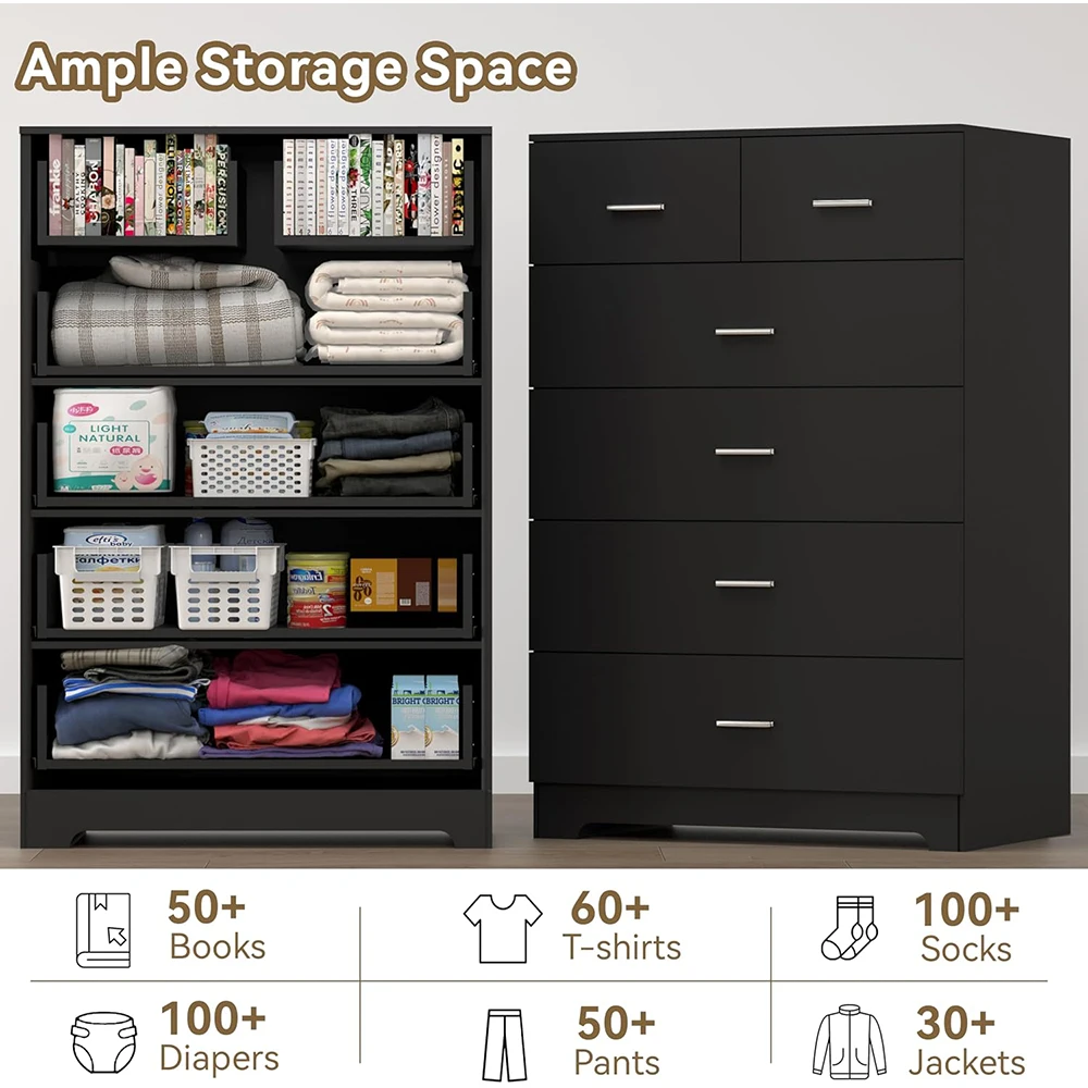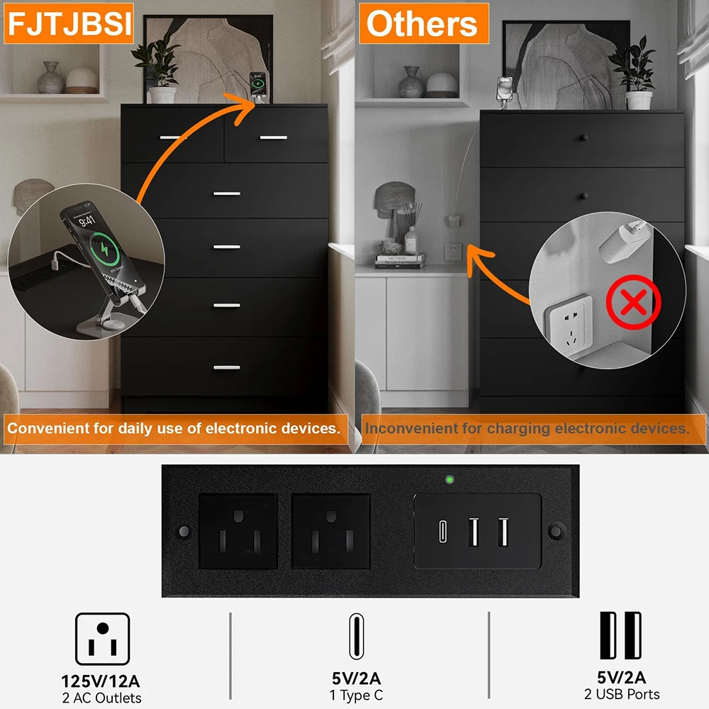 Nu-Deco MH25809 6-Drawer Wooden Modern Dresser with Power Outlets Black Tall Storage Smooth Metal Rail for Bedroom