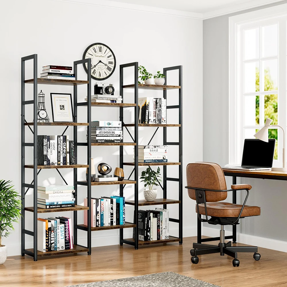 Nu-Deco MH26017 Triple Column 5-Tier Adjustable Rustic Industrial Modern Bookshelf 14 Open Display Shelves for Bedroom Living