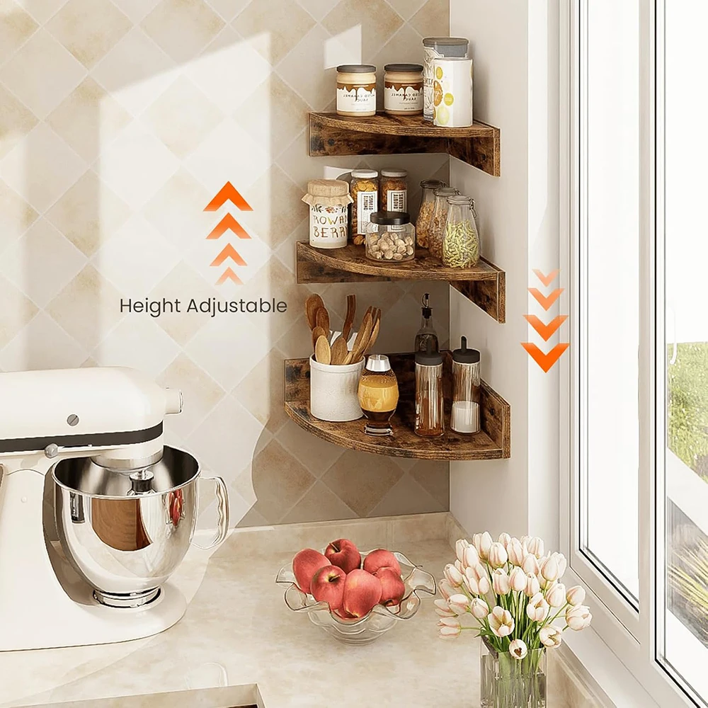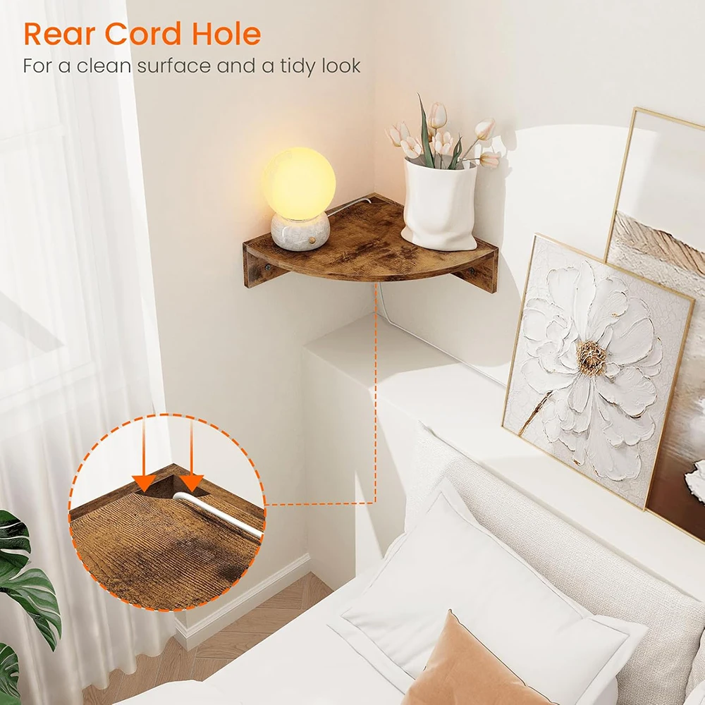 Nu-Deco MH26062 Corner Shelf Wall Mount Set 3-Tier Floating Wood Display Shelves Cord Hole for Bathroom Bedroom-Rustic