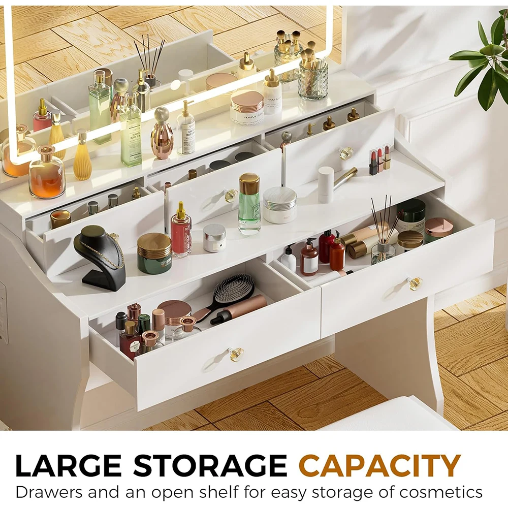 Nu-Deco Modern Wood Makeup Vanity Desk Mirror Lights Table Chair Set 5 Drawers Charging Station Bedroom Dresser LED Stepless