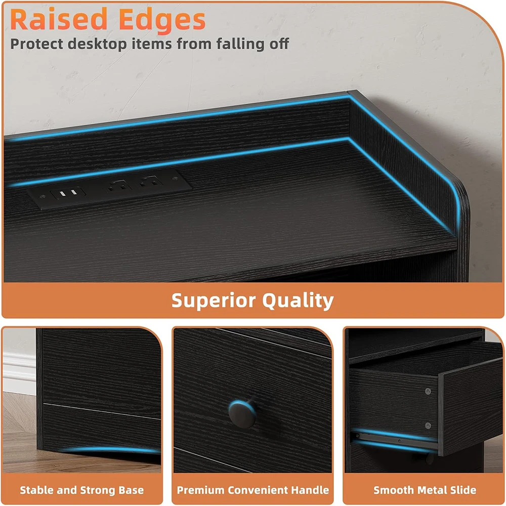 Nu-Deco Modern Wooden Nightstand Charging Station LED Light USB Ports 2 Storage Drawers Small Bedroom Dresser for Small Spaces