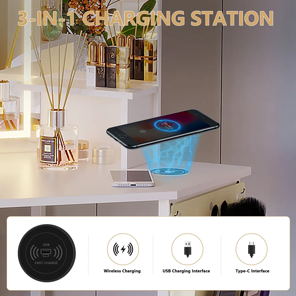 Masa de Toaletă în Stil Nordic Modern cu Oglinie Luminoasă din Lemn MDF cu Spațiu de Depozitare pentru Dormitor, Hotel sau Cameră de Îmbrăcat