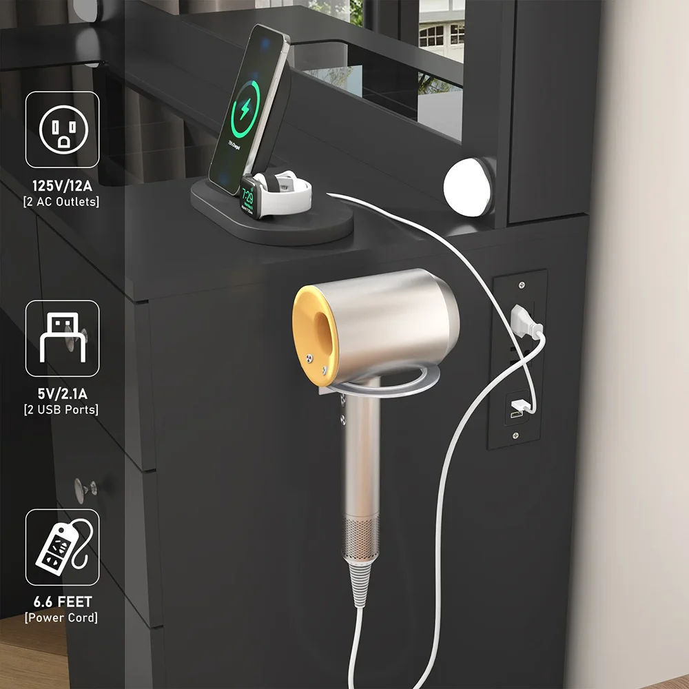 Lyxbord för sminkning med belyst spegel, snabbladdningsuttag, tålig glastoppsdressoir, sovrumsinredning med förvaring