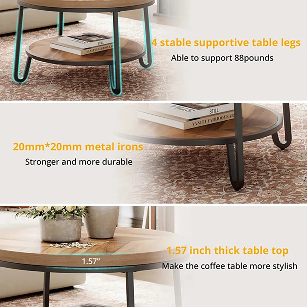 Modern 32\" rund dekorativt bord med 2 hyllor för lagring, enkel montering, med trästruktur, för vardagsrummets kaffebord